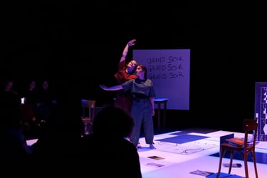 Oscillant entre moments plus “spectaculaires” et des temps de composition au plateau, elles mettent en lumière le processus de création de l'œuvre (éléments apportés ou préexistants à la création, ré-écriture et composition) et questionnent leur place de jeunes artistes et jeune compagnie dans l'écosystème politique actuel (droit d’auteur, réalités de production, enjeux d’une première création…).