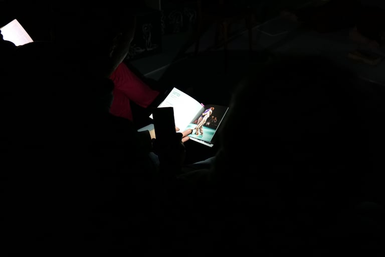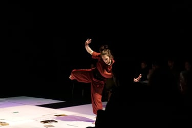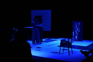 Les spectateur.rice.s, dans un dispositif tri-frontal, sont au cœur de l'œuvre et sont invité.e.s à prendre part, à leur tour, au processus exploratoire.