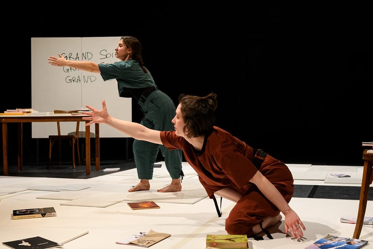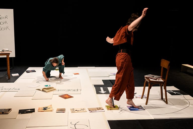 Au plateau, deux danseuses-exploratrices jouent avec des figures de la danse et cherchent à se faire une place dans une histoire de la danse qui s’écrit au présent. Pour cela, elles annotent et reconstruisent l’espace du plateau.